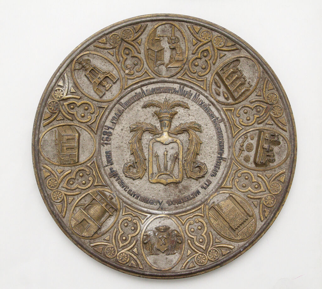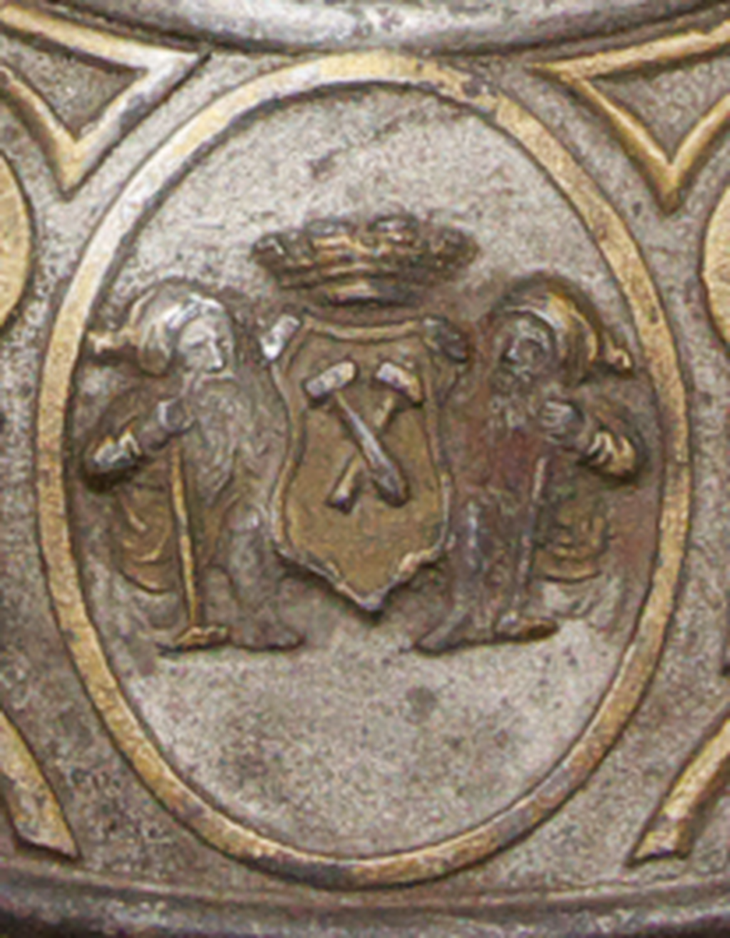 Среди экспонатов выставки «Тайны старинного замка», проходящей в эти дни в музее, представлено декоративное подносное блюдо (копия), изготовленное мастеровыми Холуницкого завода 10 июля 1884 года для владельцев Викентия Альфонсовича и Марии Михайловны Поклевских – Козелл. По краю блюда – барельефы плотины, заводское здание, домна, заводские механизмы и … гномы - любопытный геральдический сюжет: два гнома с кирками в руках придерживают щит, на котором изображены скрещенные молот и кирка, вверху кирпичная корона.