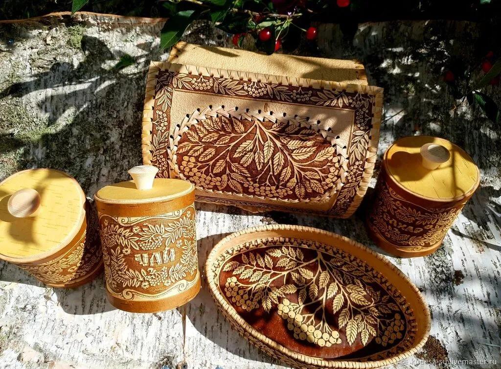 Изделия из бересты представлены на нашей выставке. Это работы Похолкова Николая Петровича. Берестяные очелья, браслеты, пояса, подносы, погремушки, тарелочки, туеса. Все они радуют глаз, дарят здоровье и являются необходимыми в быту.